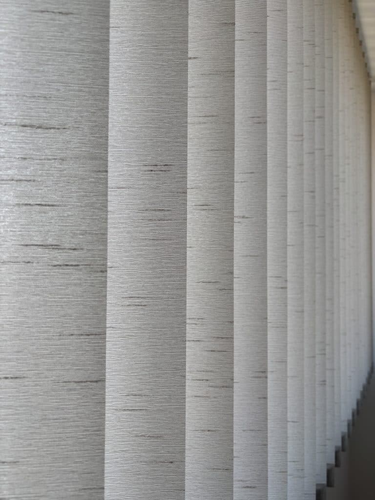 Le Store à lamelles verticales (Toile COMORES) : Idéal pour les grandes dimensions. Sa texture apporte un aspect textile chaleureux, loin de l’image ‘bureau’ que l’on peut parfois avoir des stores verticaux.