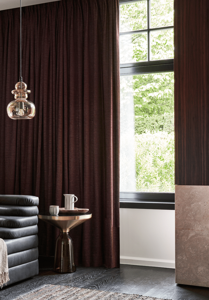 Cet hiver, cette chaleur intérieure s’exprime dans la tendance Cosmic Theater, où les matières nobles et les teintes profondes – comme le Cherry Red, couleur phare de la saison – transforment la fenêtre en véritable scène de style.