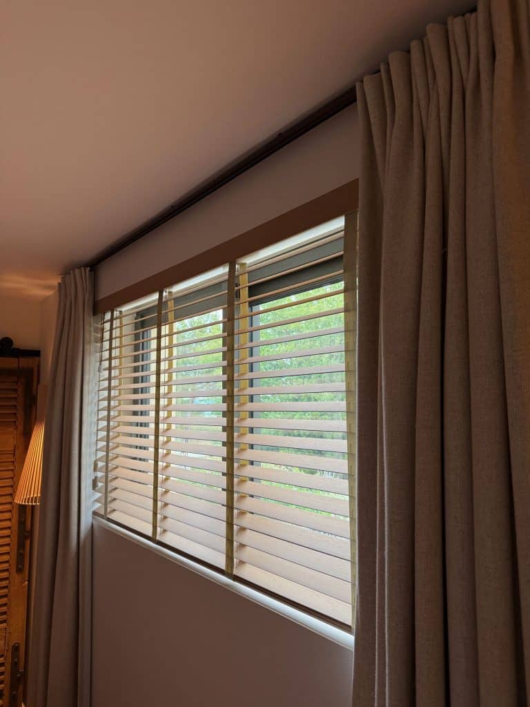 Dans les chambres, nous avons choisi d’installer des stores en bambou taupe, combinés à des rideaux RIO NATUREL doublé occultant, le tout posé sur des barres techniques fixées au plafond. Ces stores sur mesure apportent une ambiance chaleureuse et naturelle tout en répondant au besoin d’occultation et de confort thermique.