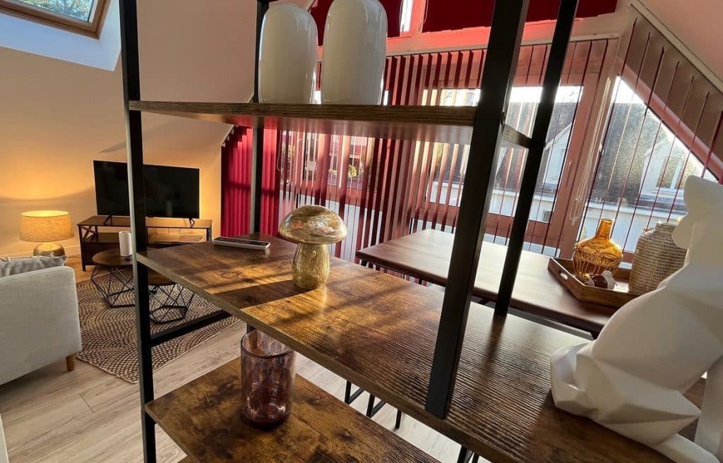 Le second logement, quant à lui, se distingue par son caractère affirmé. Le store californien rouge Maui Rubis devient un élément décoratif à part entière, créant un contraste original tout en répondant aux besoins fonctionnels du client.